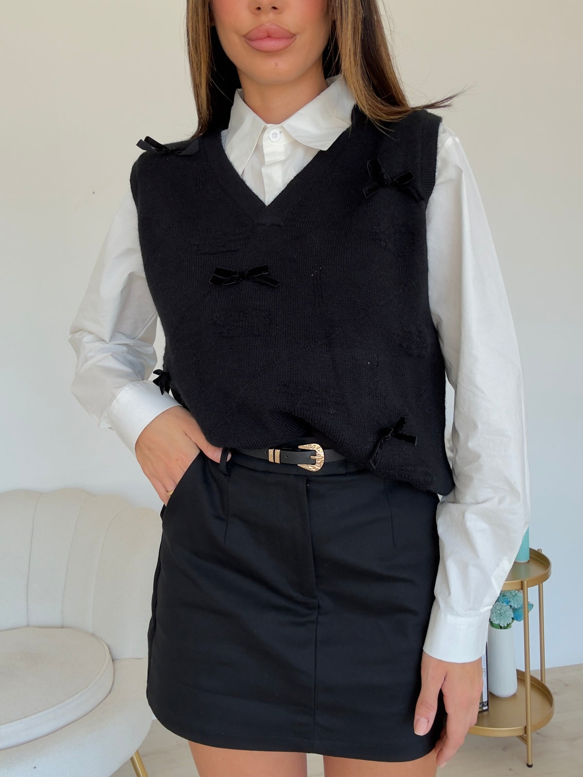 Camicia basica chiusura con bottoncini + gilet scollo V con fiocchi cuciti