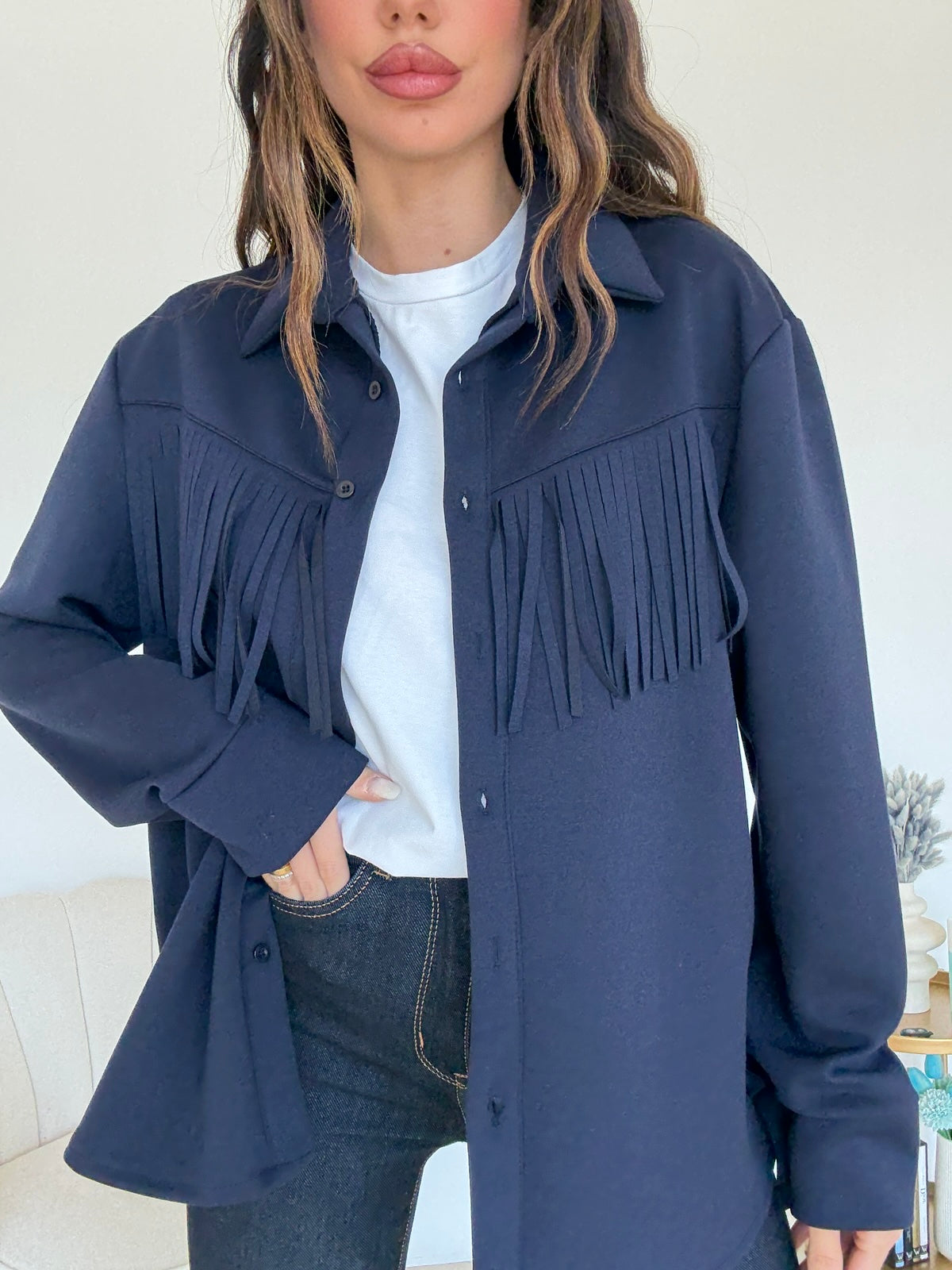 Camicia oversize manica a sbuffo, chiusura con bottoncini centrali e frange a rilievo
