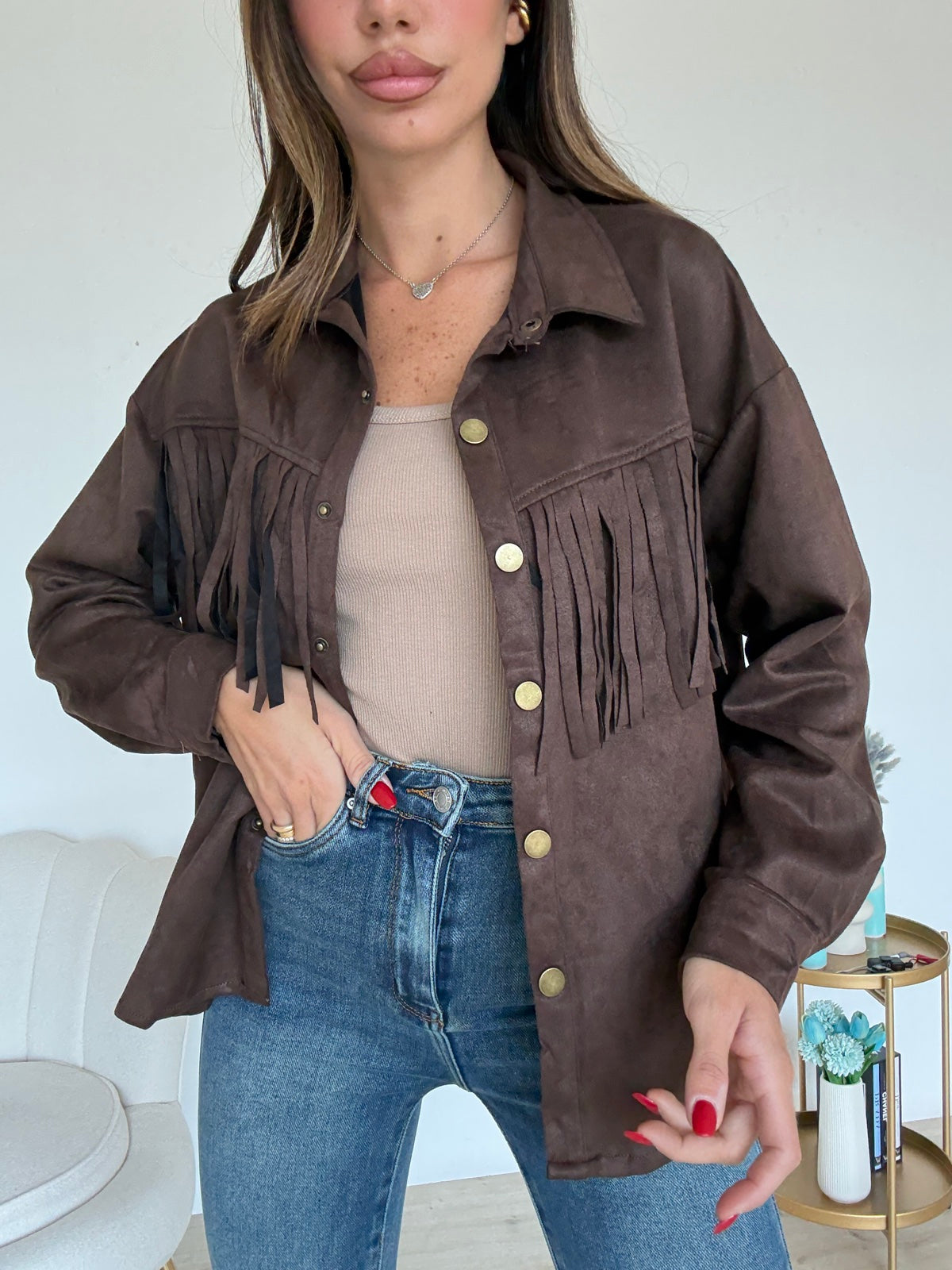 Camicia in eco camoscio con frange, chiusura con bottoncini a pressione, manica a sbuffo