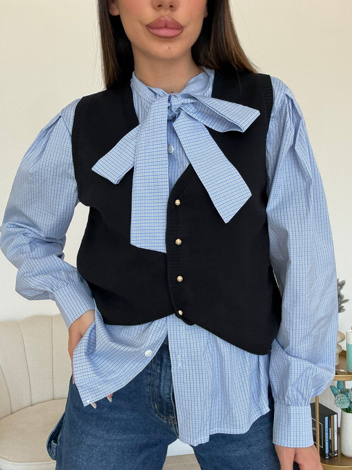 Gilet+ camicia : Camicia a quadretti chiusura con bottoncini centrali e fiocco regolabile + gilet bottoni oro