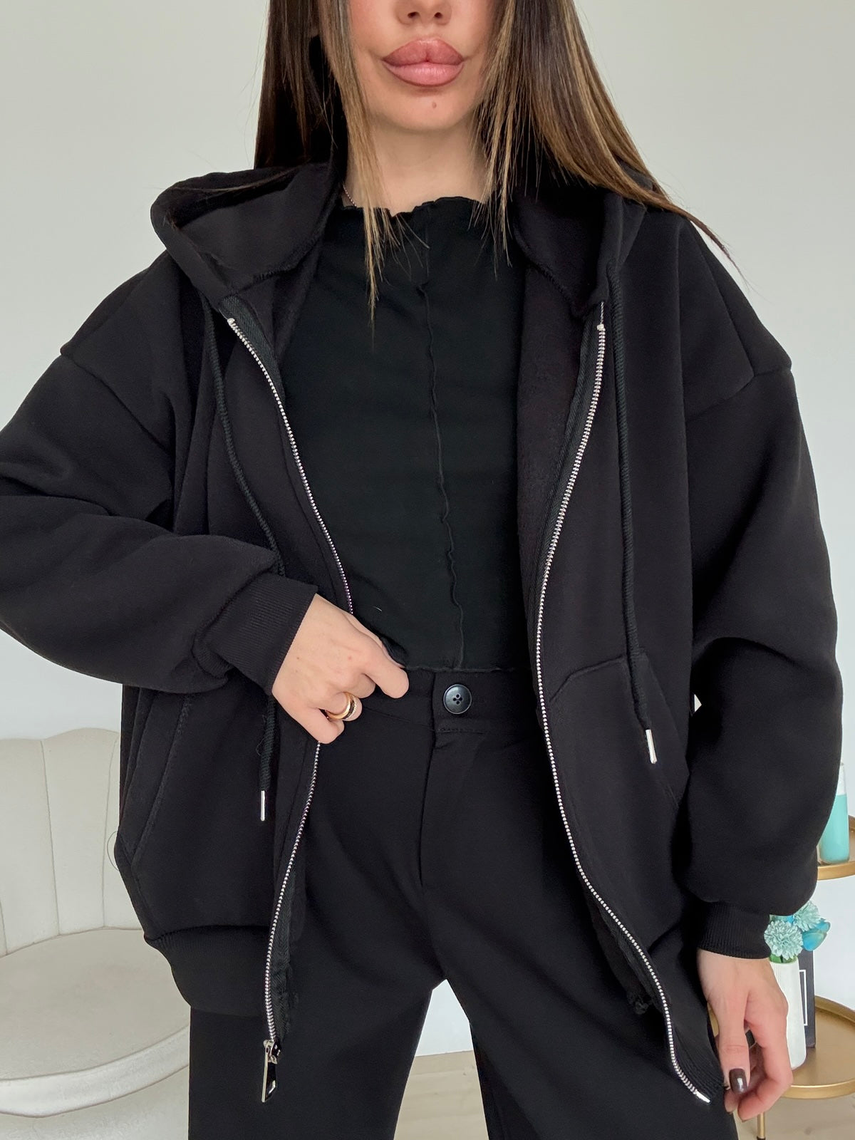 Felpa oversize pile interno , manica a sbuffo , zip centrale e cappuccio sul retro