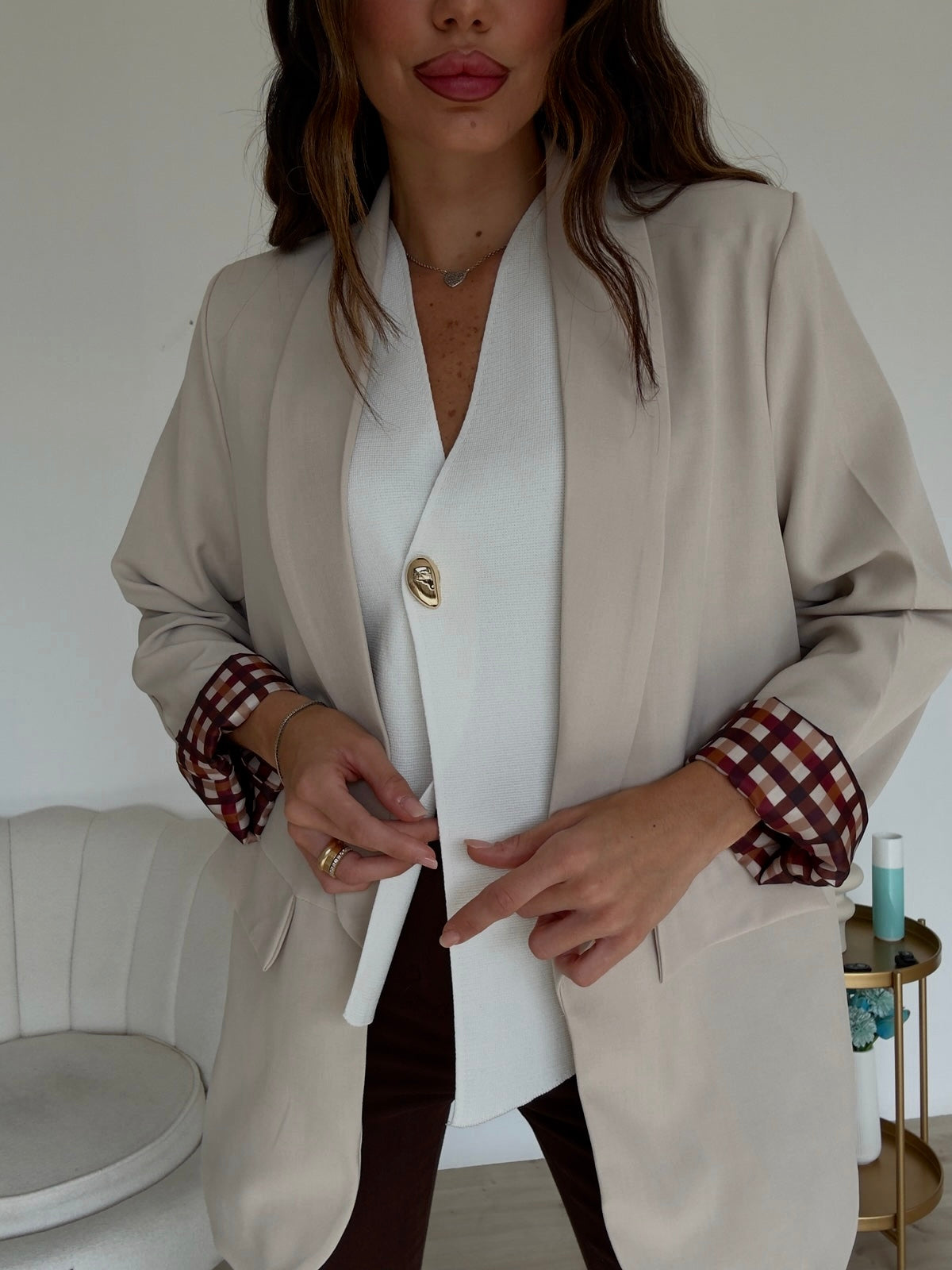 Blazer oversize collo sciallato , senza bottoni fodera interna a quadretti con possibilità di risvolto alle maniche