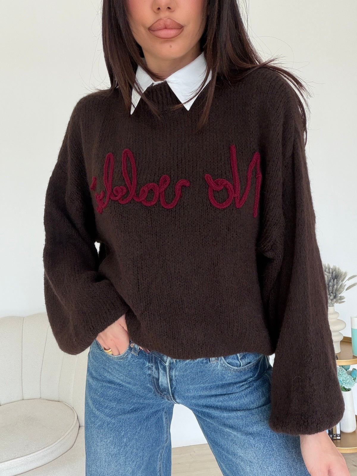 Pull girocollo con scritta NO VABBE' ricamata a rilievo, manica a sbuffo, girocollo