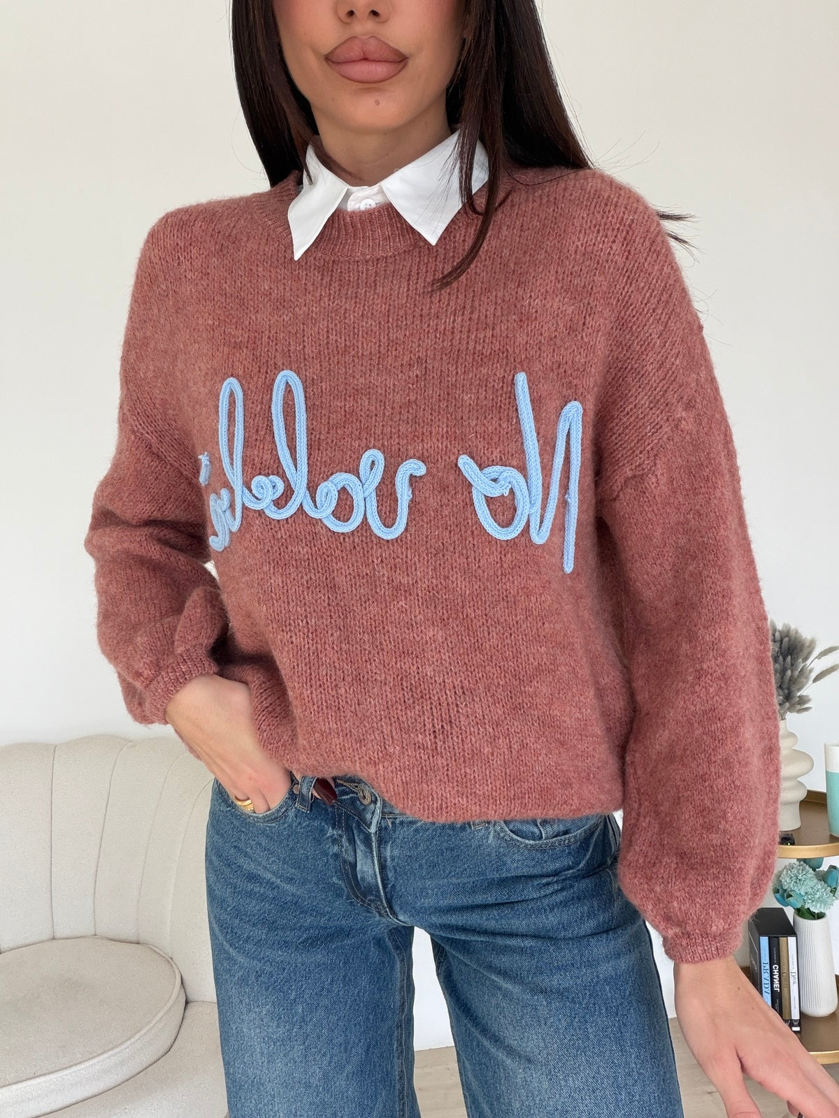 Pull girocollo con scritta NO VABBE' ricamata a rilievo, manica a sbuffo, girocollo