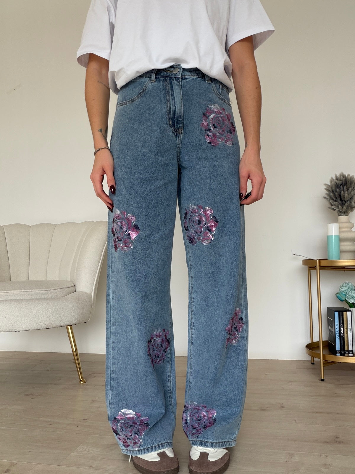 Jeans gamba dritta con paillettes a rilievo ,elastico in vita sul retro