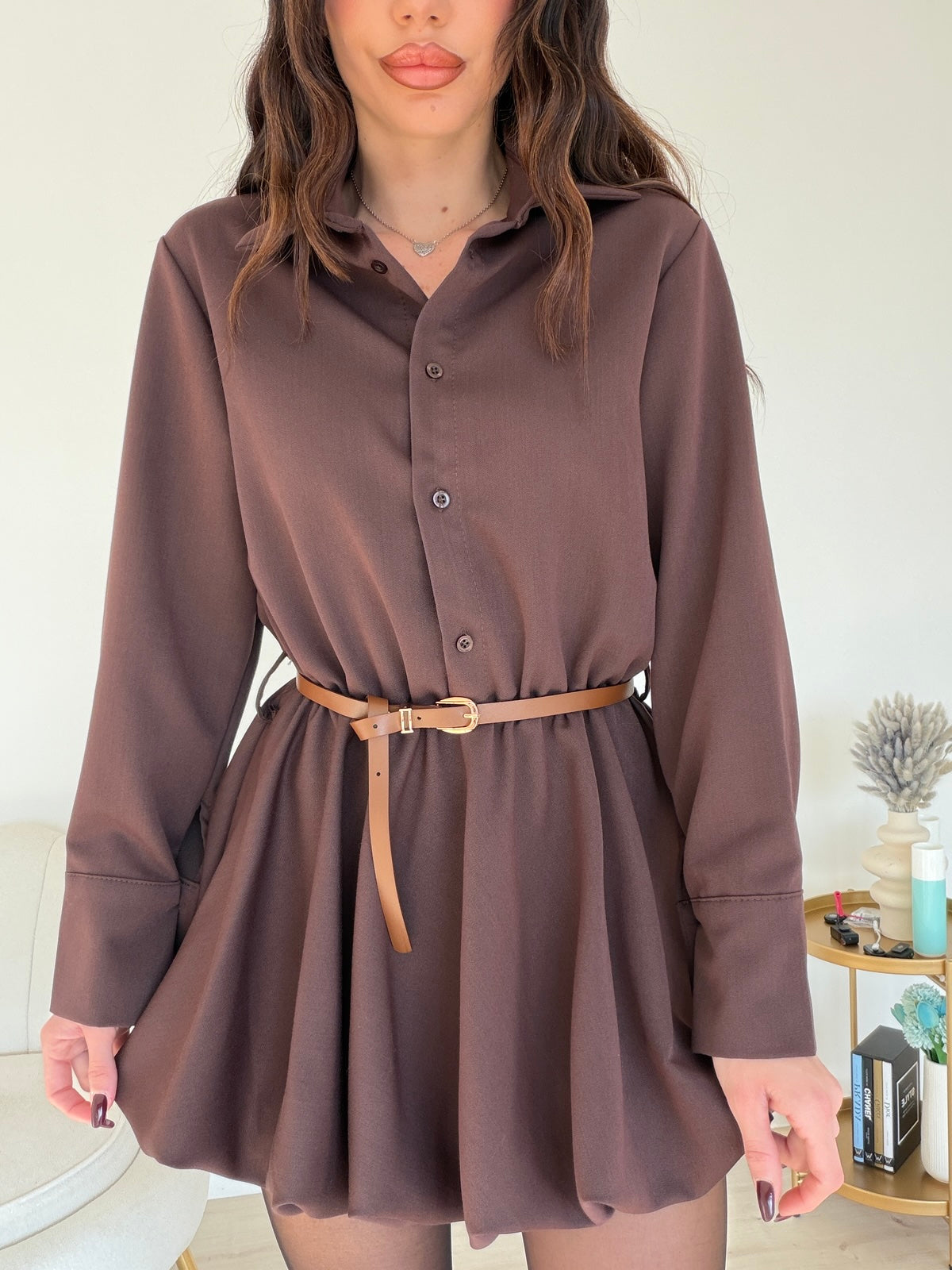 Mini abito in stile chemesier , bottoncini centrali , gonna a palloncino con elastico sul fondo, cintura in vita regolabile e removibile