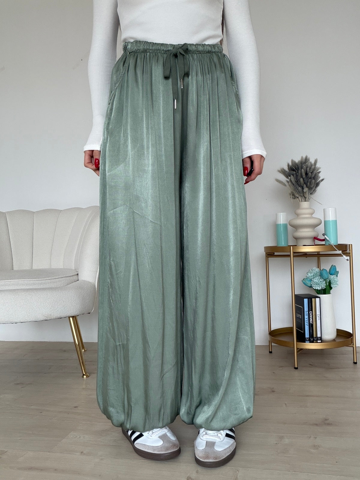 Pantalone ballon effetto satin con elastico in vita e coulisse regolabile;elastico alle caviglie