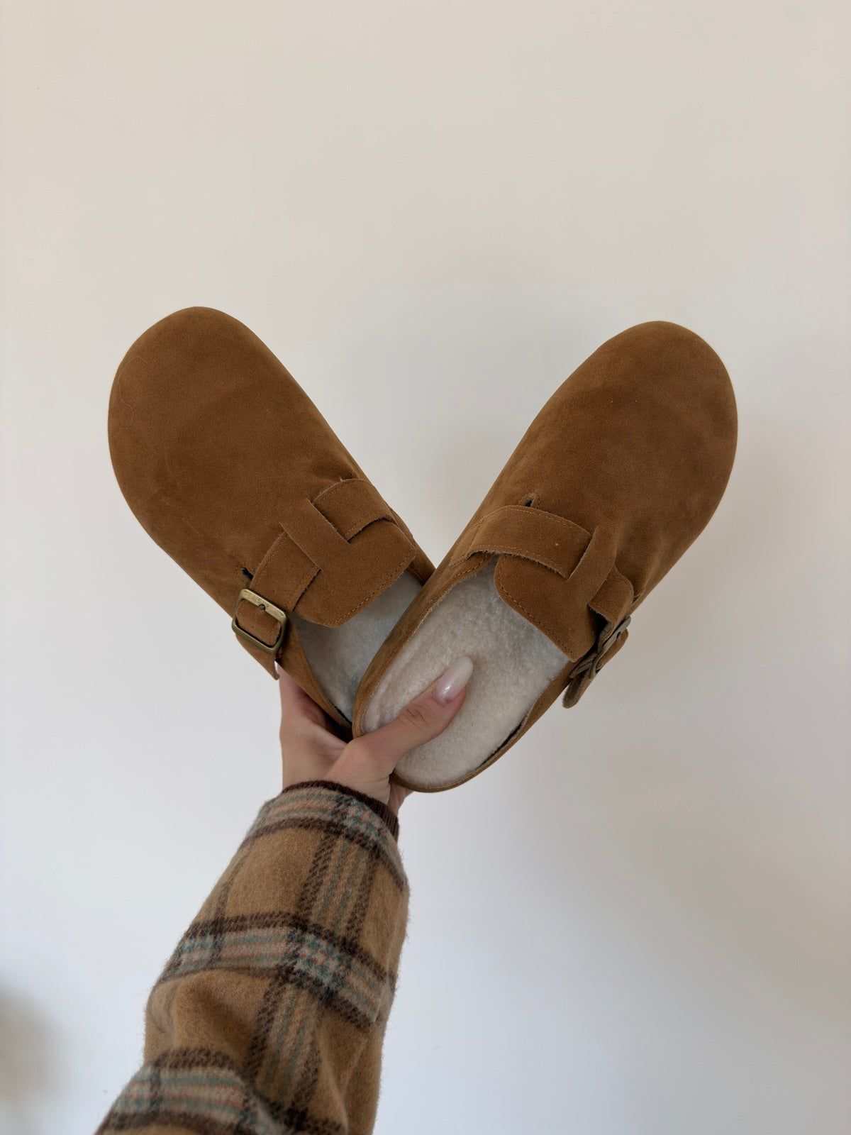 Giusy-mules in eco camoscio con ecopelliccia interna