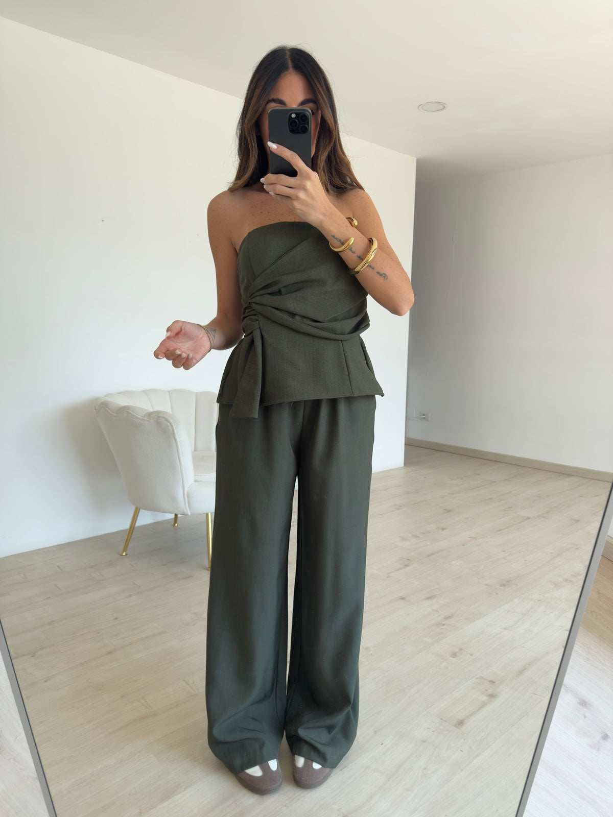 Coordinato Ambra : Blusa a fascia , drappeggio sul retro , coppa preformata e fusciacca non removibile + pantalone palazzo con elastico in vita